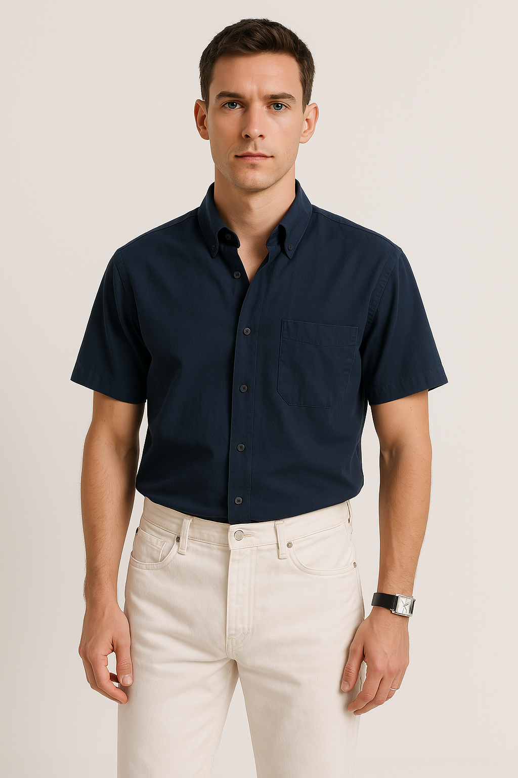 - Design: Casual button-down with chest pocket, short sleeve, relaxed fit