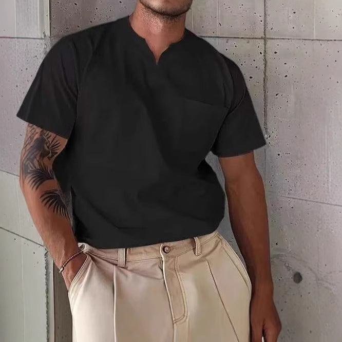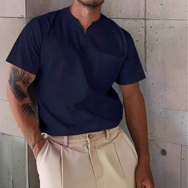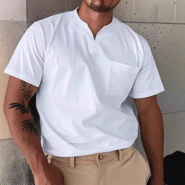 Men's V-neck T-shirt – Slim Fit – Chest Pocket – Breathable Natural Textile